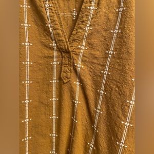 Excellent used condition 100% cotton (no stretch) top with rolled short sleeves, mustard colored with white embroidered detail, textured fabric, high-low hem with side slits. Fast shipping.