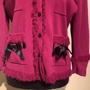 Beautiful high quality brand in a pretty magenta with black accents. Ribbon bows at pockets. Frayed edge detail throughout