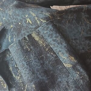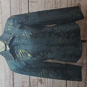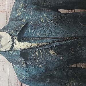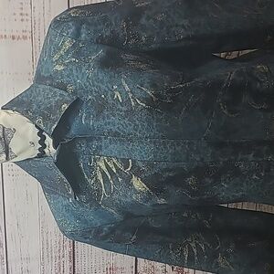 Rich blue with metallic gold fabric. Long sleeve zipper front with side pockets. Fully lined. Like new condition.