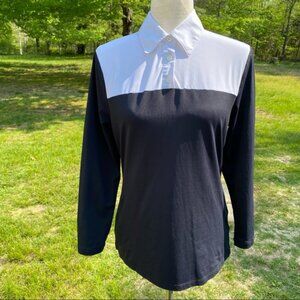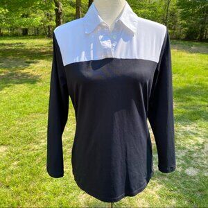 DONCASTER WOMENS TOP BLACK WHITE COLOR BLOCK STRETCH POLO STYLE COLLAR BUTTONS SIZE S
