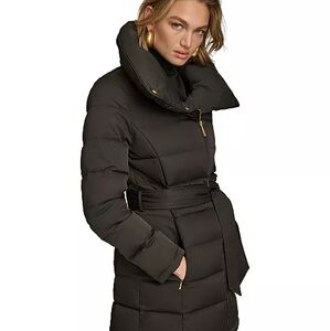 Donna Karan New York revamps the puffer coat with this chic version designed with a self-tie belt and an asymmetric front zip.Perfect for cold weather