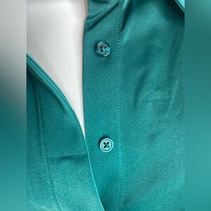 This elegant midi dress by Donna Karan features a sophisticated A-line silhouette with a pleated skirt that falls gracefully to mid-calf. The rich green hue complements the shirt-style design, complete with a polo collar and 3/4 cuffed sleeves, making it perfect for both work and casual occasions. #giftforher #christmasparty #holidayparty #businessattire #greendress #designergreendress #donnakarandress