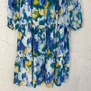 DONNA MORGAN Linen Floral Midi Dress Size 10 Puff Sleeve Square Neck Bohemian Prairie Tiered Long Lagenlook