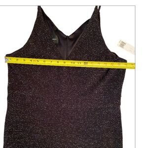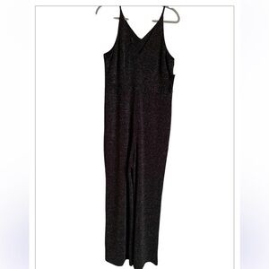 New with tags sparkly black v-neck jumpsuit with side pockets, thin straps and enclosed black zipper.