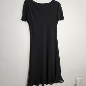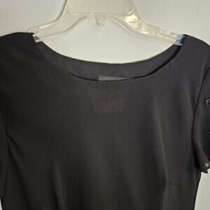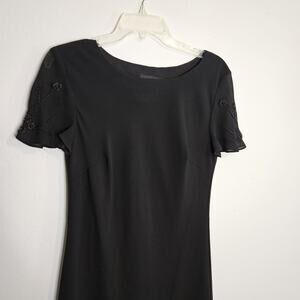 This Donna Morgan Women's Size 8 Black Cocktail Dress is a dressy and semi-formal option for special occasions like weddings, parties, or formal events. The dress features a round neckline, short flared sleeves, and is adorned with bead accents for a touch of glamour. Made from lightweight chiffon polyester, this midi length dress is perfect for all seasons and offers a stretchy and comfortable fit with a pullover closure for easy wear. Each dress is lined and designed with a classic and elegant style, fitting for a princess or Belle-like character. Like new condition