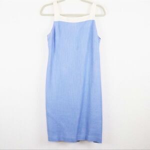 DONNA RICCO light blue with white trim sleeveless sheath dress with square neckline and back kick slit, and open short sleeved bolero cropped jacket with small shoulder pads.