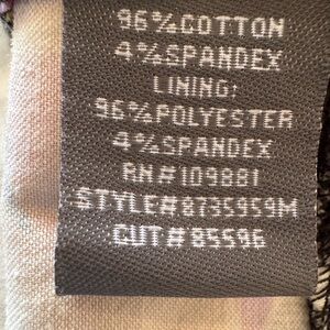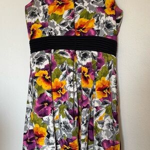 Beautiful purples oranges greens and black colors. Flattering fit. Zipper down back and pockets.