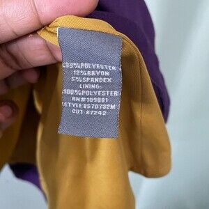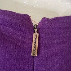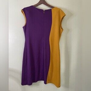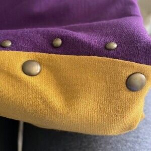 Cute little number! Purple and chartreuse colorblock with brass hardware throughout! One medallion may be missing on front but presents well. Not noticeable.