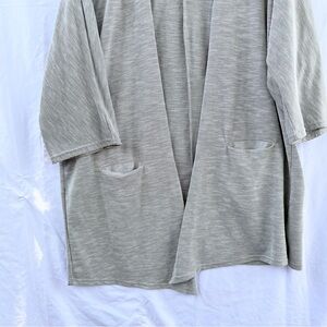 • Grayish ribbed. Long sleeved. Pockets. Open cardigan sweater. Year round piece. Easy to throw on and packable. Lightweight. Soft and cozy to the touch.