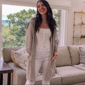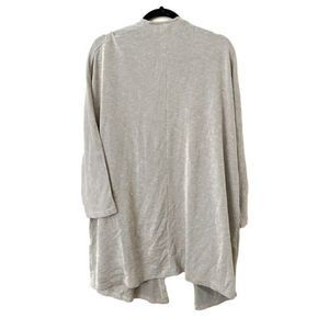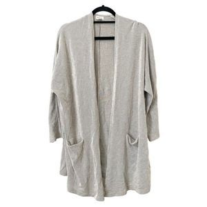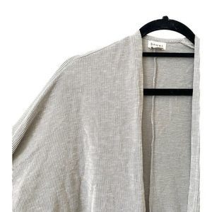 Gray/white ribbed/striped cardigan. Slouchy fit. Front pockets. Cotton, polyester, spandex blend. Great preloved condition! One size fits all