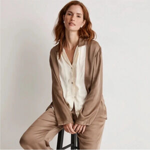 **Fit:** Slouchy, relaxed fit; falls below the hips **Features:** Silky fabrication, lightweight design, V-neckline with collar, button down style, slightly dropped sleeves