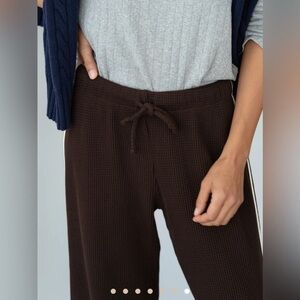 The Thermal Crop Stripe Pant is crafted from soft, breathable thermal. It features a cropped fit, double stripe detail, waffle texture, and an adjustable drawstring waistband for effortless style and comfort