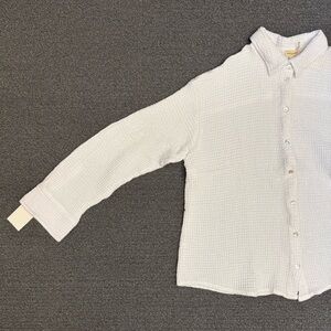 DONNI. The Waffle Button Down in Powder - Relaxed Fit - Collared Neckline - Mother-of-Pearl Buttons Down Front & Sleeve Cuffs (Second Button Down from Collar at Front is Very Loose as Pictured) - Size Small - New with Tags