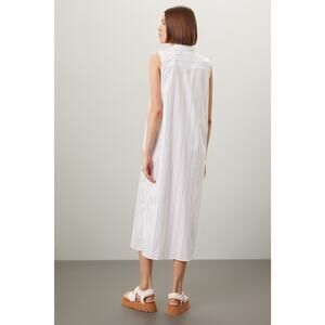 This DONNI sleeveless dress combines casual charm with polished style, featuring a crisp white and blue striped design. The collared neckline and button-front closure add a tailored touch, making it versatile for both relaxed and semi-formal settings. Crafted in a lightweight fabric, it offers breathable comfort for warm-weather days. Its relaxed fit and effortless silhouette ensure all-day ease while maintaining a chic appearance. Perfect for pairing with sneakers for a laid-back look or sandals for a more refined vibe, this size L dress is a timeless wardrobe staple.