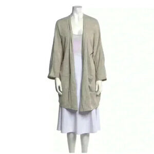 Elevate your wardrobe with this DONNI. gray striped cardigan featuring a V-neckline and kimono sleeves. Made from a cotton blend knit fabric, this relaxed fit sweater is perfect for travel and casual occasions. The oversized design includes pockets and an open front for added style.