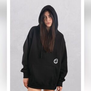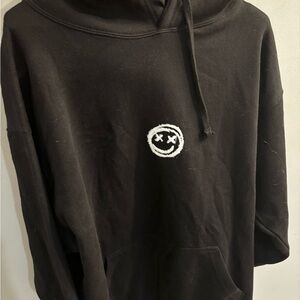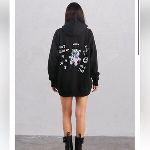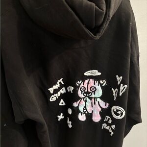 Edgy Black Graphic Hoodie with "Don't Grow Up" Design. This cool black hoodie features an oversized fit and a unique graphic print on the back. The design includes a distressed, pastel-colored teddy bear with stitches and a halo, surrounded by playful, graffiti-style text that reads "DON'T GROW UP" and "IT'S A TRAP," along with various symbols like hearts and an "XX" emoji. The front has a smaller embroidered "XX" smiley face. It has a classic drawstring hood and a kangaroo pocket. Perfect for a casual, rebellious, and artistic statement!