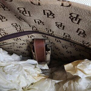 "DOONEY AND BOURKE signature anniversary canvas & leather tote bag This magnificent tote is the original vintage Dooney & Bourke Anniversary Signature Medium Tote. Comes with side loading ID Window Tag Key holder, which is perfect for your ID Access card.