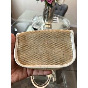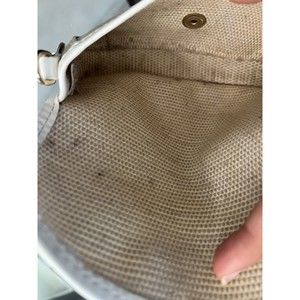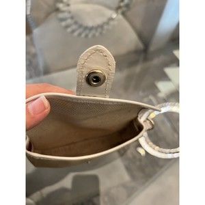 Inside, the wristlet is lined with beige canvas and features silver hardware accents that add a touch of elegance. The product is pre-owned and in good shape, .This wristlet is perfect for women who value fashion and functionality.