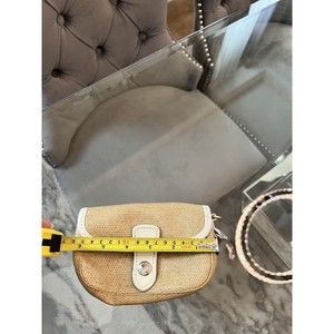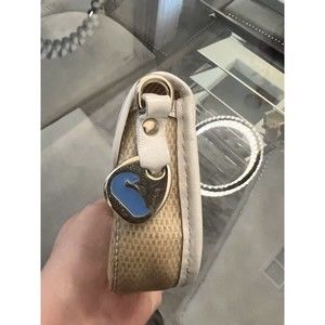 This Dooney Bourke wristlet is a stylish accessory that will complement any outfit. It features a snap closure for easy access to your essentials, and has a beige handle/strap that adds a touch of sophistication. The mini size makes it the perfect choice for a night out, and the canvas exterior material is durable enough to withstand daily wear and tear.