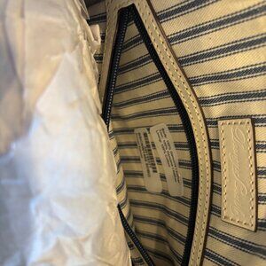 This unique bag has never been used. The bar code for purchase is still inside it, but no hanging tags. It is in perfect condition with dust bag. The craftsmanship displayed in the leather emulate a basket weave is tremendous! Interior striped lining in excellent condition.