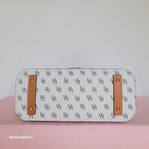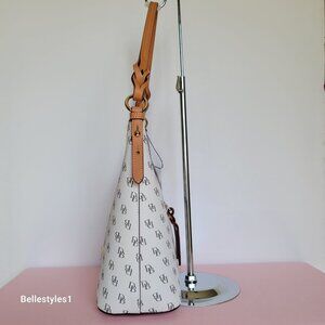 BRAND NEW WITH TAGS. Bone color. The D&B Bryce hobo bag designed in a Signature logo print with a shoulder leather strap for comfortable wear. Crafted of water repellent coated fabric with smooth leather trim. Features a back zip-pocket for easy access and added storage.