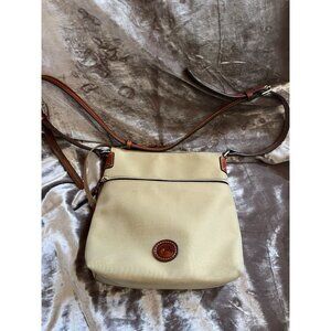 This Dooney & Bourke crossbody bag is a stylish and practical addition to any wardrobe. The exterior is made of durable canvas material in a lovely tan color, perfect for any occasion. The bag features a crossbody strap for hands-free convenience and a spacious interior for all your essentials. It's a great choice for everyday use or for trips and adventures.