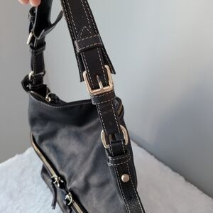 • Features two outside zip pockets. Inside zip pocket. Cell phone pocket. Inside key hook. Adjustable strap. Lined. Zip closure.