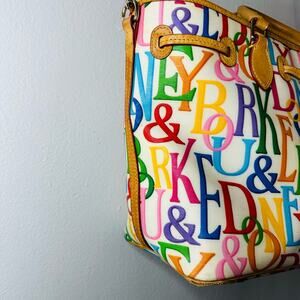 DOONEY & BOURKE Gráfica Retro East West Shopper Shoulder Strap Handbag. This Dooney & Bourke Gráfica Retro East West Shopper offers a unique and trendy look with its eye-catching print. The spacious interior makes it practical for everyday use, and the shoulder strap allows for hands-free carrying.