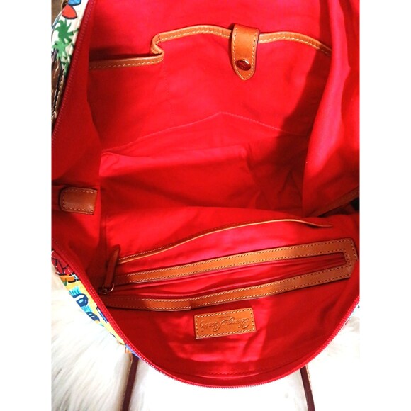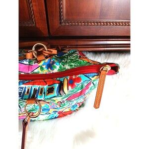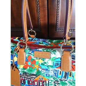 This RARE DOONEY & BOURKE is a large nylon and leather sandbar tropical vacation tulip shopper tote. It's a very stylish and modern handbag featuring vibrant colors in a tropical pattern. Made from a durable nylon with a red fabric lining, this tote has interior pockets, slot openings for credit cards, and a leather interior key chain. The bag comes with a top zip closure, double leather handles, and gold hardware. It has the iconic Dooney and Bourke leather charm and leather logo on the front. This bag measures 16" in width, 12.5" in height and 8-10" in depth. The exterior is made of a high-quality nylon while the handles, trim and logo accents are all leather. Both spacious and lightweight, this Dooney & Bourke tote offers a timeless elegance with long life durability, making it the perfect piece for those who appreciate luxury, rarity and refined craftsmanship. Excellent Condition!