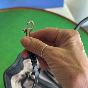 Dooney and Bourke signature black canvas, tote, shoulder handbag, leather key holder, double leather strap handles buckle closure interior zip pocket and a wall zip pocket and two slide pockets on other side has silver hardware. The metal closure has got scratches on it as shown in pics and the inside lining is marked and stained, so I have a good price. Measurements and pics, with questions.