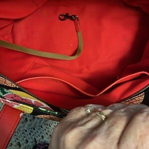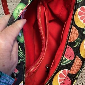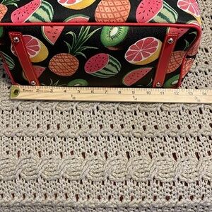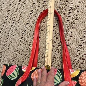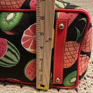 Large DOONEY & BOURKE Summer Fruit Print Zipper Tote Purse Black with Watermelon Pineapple Kiwi. Red Leather Straps, 16.5x11x6.5 with 2 inside pockets one side & a zipper pocket & open pocket on other side. Key clip inside, top zipper flap folds flat to carry as open tote or zip for security. I have literally carried this around the world with me.