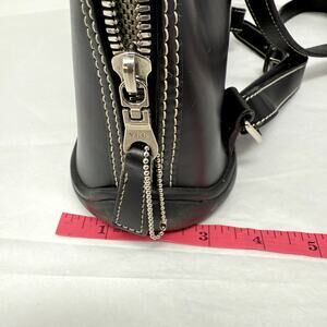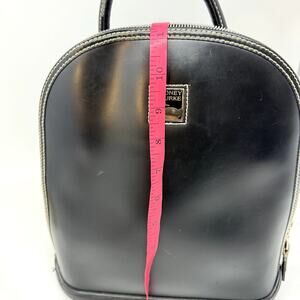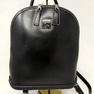 It has a domed top, dual zipper closure, a top handle, and adjustable shoulder straps. The Dooney & Bourke Parasole backpack is a vintage style from the brand, known for its durable leather and a distinctive molded rubber bottom. It is a smaller backpack style and is often referred to as a "zip pod backpack" or "domed backpack".