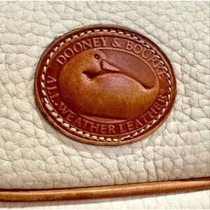 This is a sweet (& rare) Dooney & Bourke All Weather Leather Crescent Sac Shoulder Bag in Cream w/British Tan trim. She's 12" x 7.5" x 5.5", with a double-buckled & adjustable strap (drop of 15" - 20"). She has brass hardware and original solid brass D&B fob. She's a crescent-shaped bag with a thick and padded shoulder strap that's totally adjustable. Brass plaques on each side. The D&B leather Duck Seal on the front, along with British Tan piping. Zippered top entry (leather pull). Interior has no lining (it's the suede underside of the leather. It has a flap insert with a zippered compartment and 6 card slots. The suede interior has a few small pen marks, but it's clean, fresh and smells like leather.