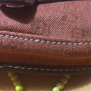 Material: Coated Canvas with Brown Leather Trim;Snap Closure;Detachable Wristlet Strap; Gold-tone Hardware; Interior Single Compartment--NWOT!