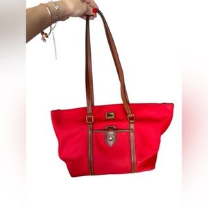 Stylish red tote bag featuring elegant brown straps. Perfect for everyday use.