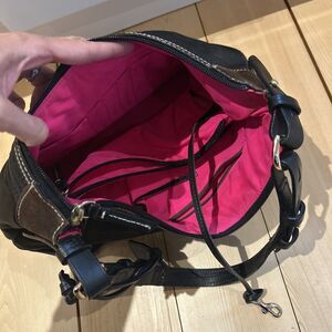 The Dooney & Bourke black nylon shoulder bag with black and brown leather trim is a stylish and practical accessory for women. With a spacious interior and multiple pockets, this large hobo style bag provides ample storage for all your essentials. The adjustable brown leather strap adds a touch of sophistication, while the silver hardware and pink lining add a pop of color. This versatile bag is perfect for everyday use and can easily elevate any outfit with its classic design and quality construction.