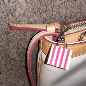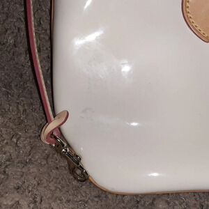 Nice satchel in rare color...creamy off-white patent leather with vachetta leather straps, handles and trim.
