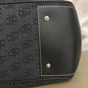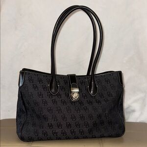 Dooney & Bourke Signature Black Canvas Tote! . Dooney and Burke logo in black on dark grey. Black leather hard bottom, stand alone style. Leather shoulder straps and silver clasps. Liner is Lt. pink. There’s a Lg zipper middle section with the DB logo which separates two deep open areas. There are 3 side pockets on one inner side, and the other inside has a zipper pocket.