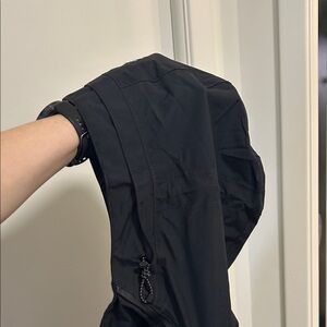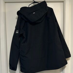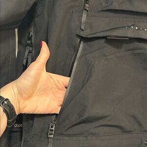 Warm. Waterproof. No flaws. Multiple pockets in front / under arm. Great jacket just changed sizes