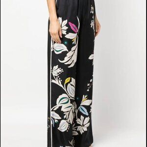 The Dorothee Schumacher Silk Tie Waist Flower Whirl Print Black pants in US size 10 are a luxurious and stylish addition to any formal wardrobe. Made from silk with an elastic waist for comfort, these wide-leg pants feature a floral pattern in vibrant colors, perfect for the summer, fall, and spring seasons. The dress pants have a flat front design and are easy to care for with a dry clean only requirement. Ideal for designer lovers looking for a touch of floral elegance in their outfit. $690 MSRP!!!! Has been dry cleaned and is in impeccable shape, just like if it were brand new. You wont regret this purchase, it's even more beautiful in person!