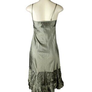 Pewter DOSA knee-length silk slip dress has spaghetti straps and raw trim at bottom