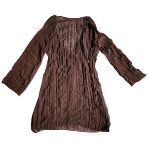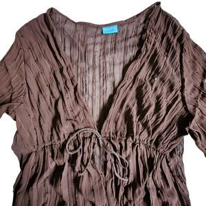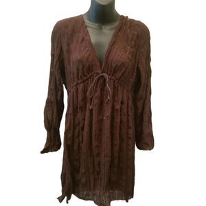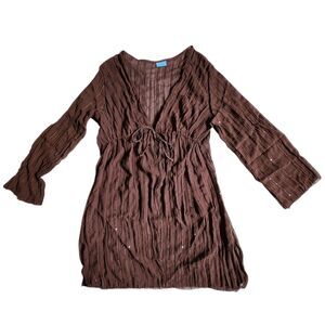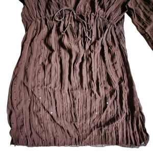 Brand: DOTTI. Occasion: Casual, Beach, Resortwear. Size Type: Regular. Size (Women's): L. Material: UNKNOWN. Color: Brown. Pattern: Solid with subtle shimmer/sequin details. Features: V-neckline, Tie front, Long sleeves, Crinkle fabric, Subtle shimmer/sequins, Sheer/lightweight. Style: Tunic, Mini Dress, Beach Cover-up.