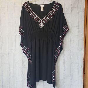 Black with eye-catching embroidery in pink, gray/blue, and white.