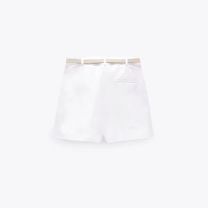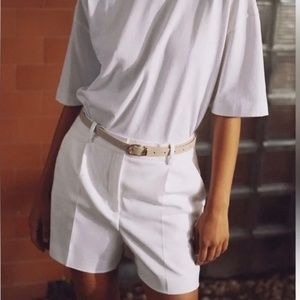 High-waisted shorts with front pleats and faux leather belt. Front pockets and back false welt pocket. Front zip, metal hook, and interior button closure.