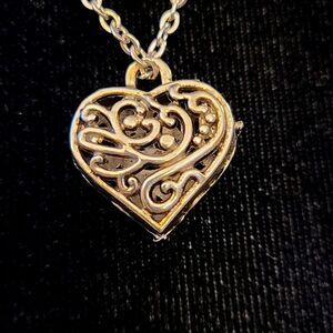 This double stranded necklace is elegant and lovely. The 18" necklace is a quite beautiful three-dimensiona openl crown. A sweet filigree heart hangs below at 23". This unique piece will fit in anywhere, from casual to dressy!