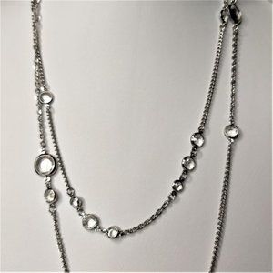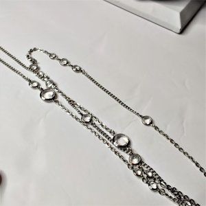This lovely double strand necklace will enhance any outfit! The first strand is about 23in with a 3in extension. It's silver tone with beveled clear round stones in different sizes. In Excellent condition!