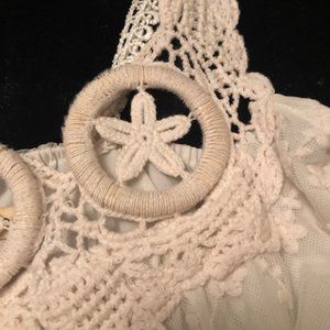 Laced straps, with three macro made star hoops and layers of cream-colored lace