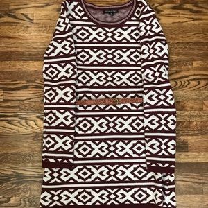 Fall perfection! Bold burgundy and white print. Great with tights, leggings, or skinny jeans. Can be worn with or without the belt. Fabric has a nice amount of stretch. Approximately 32” long, 15.5” wide, and sleeves are about 25” from shoulder to cuff. Size Medium.