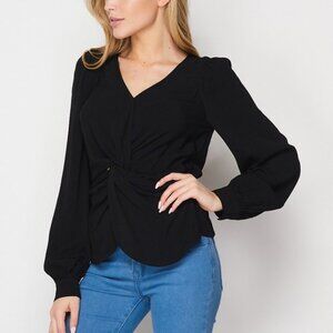Keep it classy with the DOWN TO BUSINESS Blouse. This twist front blouse has an elasticized back which created a chic fit. The split V-neck offers a feminine look & long sleeves with button cuff make it perfect from Office to Date night
