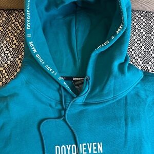 Beautiful teal color with DOYOUEVEN logo on the chest and “LEAVE YOUR MARK” branding inside the hood.